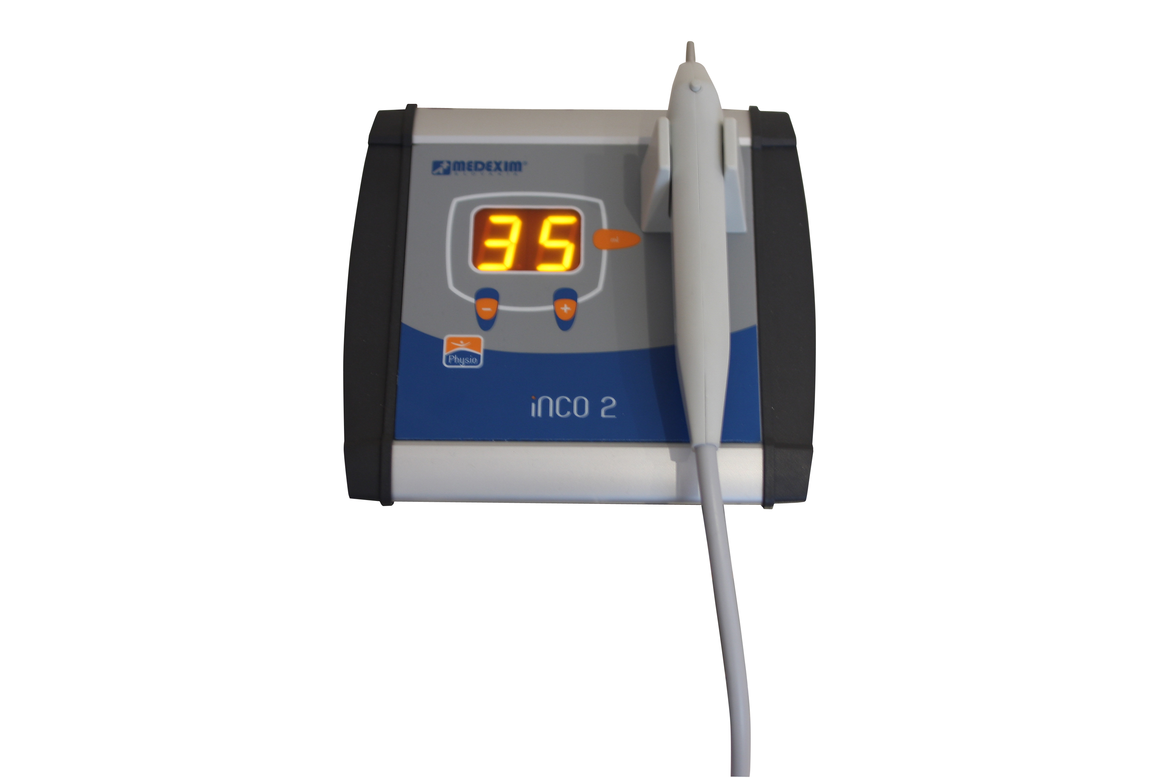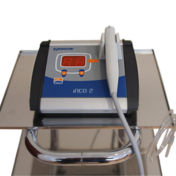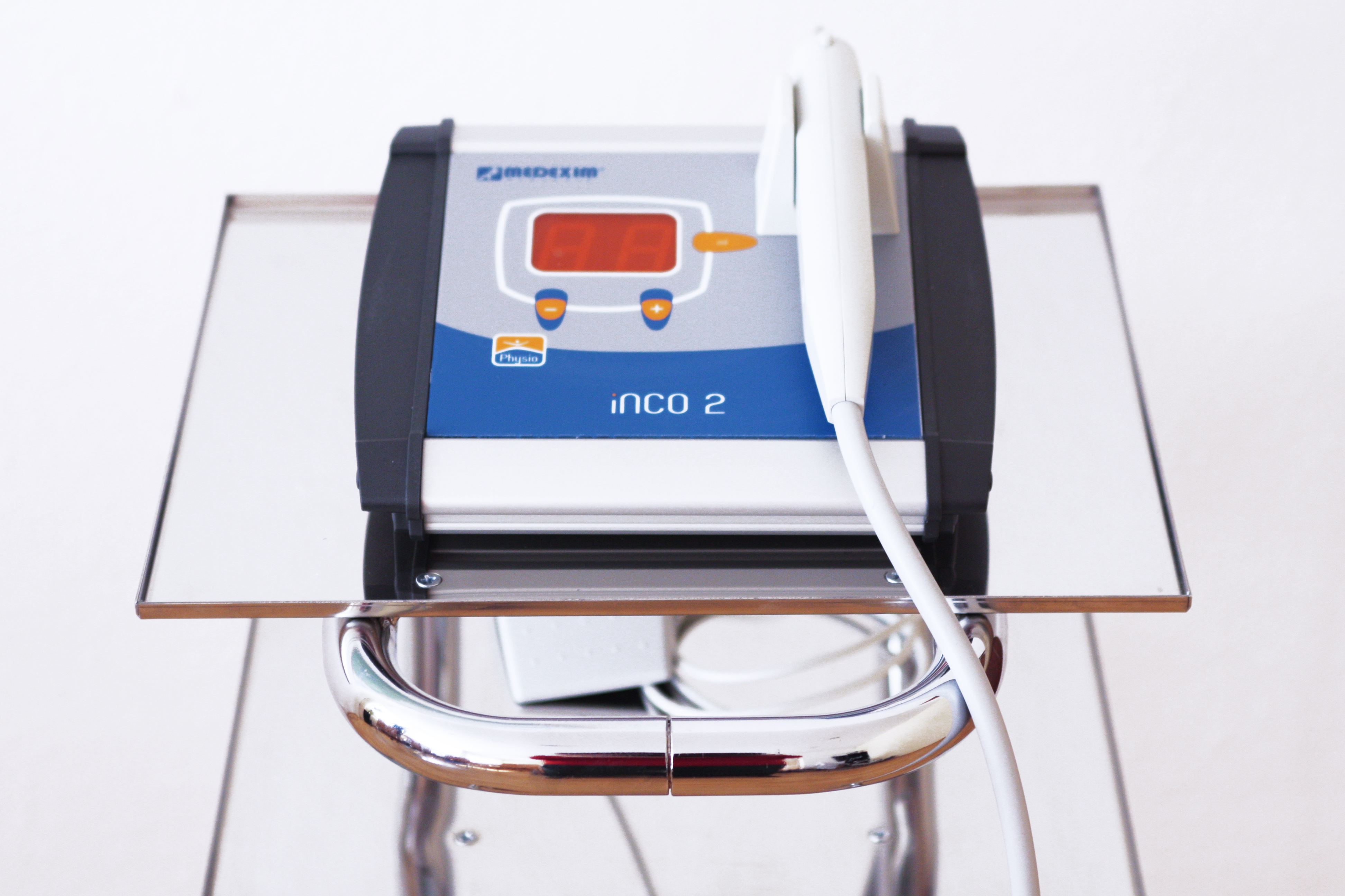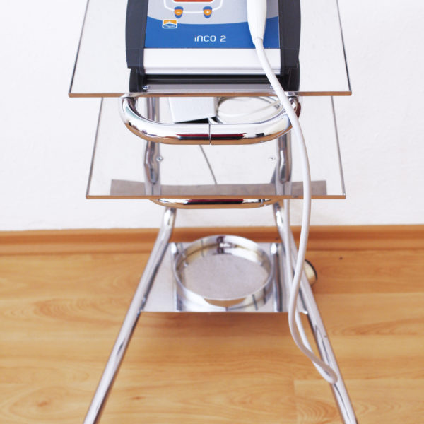 The INCO2 – KBX unit ´s components are as follows: the solitary equipment ( control unit), the applicator, pedal-operated switch, the source of line voltage and the polyurethane hose with a reduction for the connection of the device with a medical gas CO2 supply from the steel bottle. The control unit is installed in an aluminium box with the plastic side frames, which ergonomic design guarantees a good stability on the operating surface and a very comfortable access to all control and connecting elements of the device. The optimal slope of the frontal desk, the intelligible graphic, the dimension and the brightness of the LED display enable the easy and transparent manipulation with the device while adjusting the applicable dose . The operating desk contains no mechanical switch components and the parameter adjusting performs only through light touching of signs (+, -). It helps to eliminate the potential failure and keeps the device in a good hygienic conditions because of no rifts on the surface. The applicator´s holder is placed on the right side of the control desk, which shape guarantees the comfortable inserting , withdrawal and hinders the spontaneous droping out as well. On the backside of the device cover is placed the connector of the line voltage source, power switch, quick –acting coupling for a connecting hose of the CO2 source and the hose´s outgoing feeder for an applicator. The applicator´s shape fits very comfortable the right- and the left-handers as well. At the top above of applicators spike is situated the operating button and its compression causes through a microswitch impulse the release of the adjusted CO2 dose. The applicators spike is made of the stainless steel.